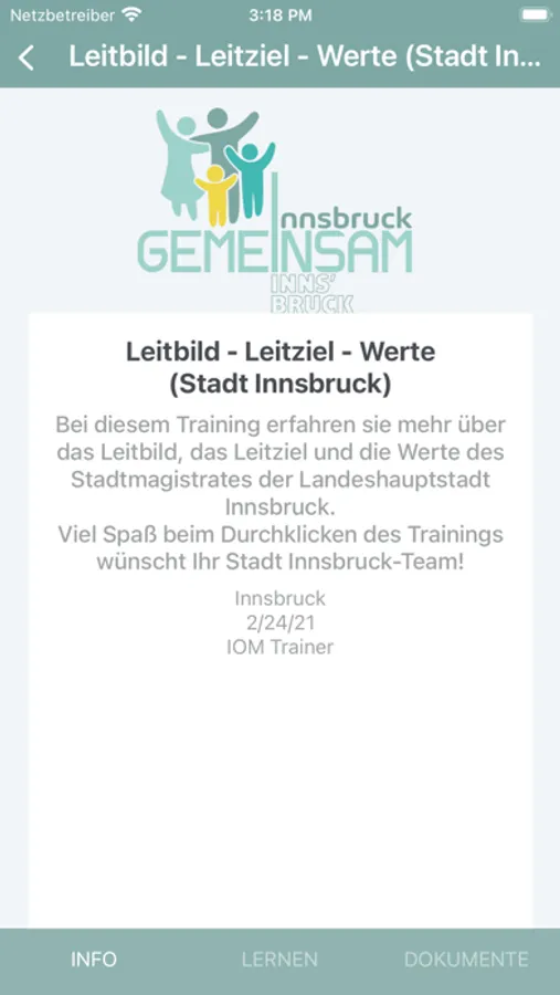 Über 1.600 Mitarbeiterinnen und Mitarbeiter kümmern sich um die Belange der Einwohnerinnen und Einwohner Innsbrucks in der zentralen Stadtverwaltung im Rathaus in der Maria-Theresien-Straße. Mit der App „Innsbruck gemeinsam“ möchten wir alle Bürgerinnen und Bürger der Stadt Innsbruck über aktuelle Themen, wie beispielsweise die Handhabung von Defibrillatoren, Verhalten im öffentlichen Raum und im Naturraum, den Umgang mit E-Scootern etc. informieren. Des weiteren soll diese App für interne Fort- und Weiterbildungen genutzt werden.