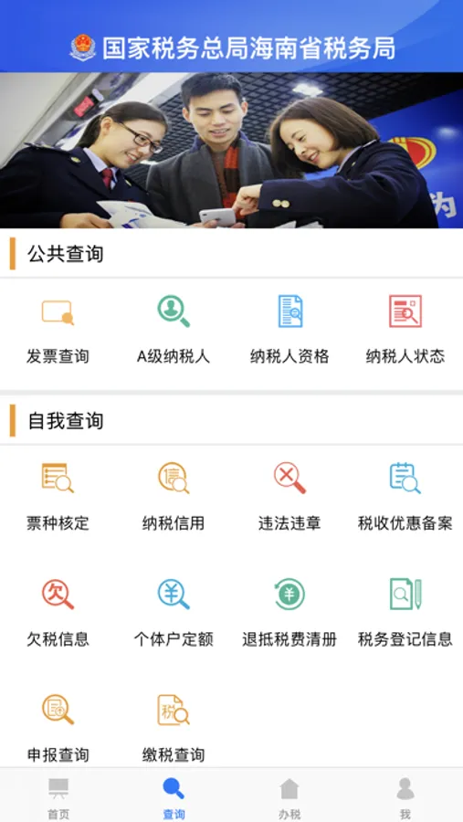海南省电子税务局app:首页提供最新的通知公告,查询板块提供公共查询和自我查询;办税板块提供申报,纳税,信息报告等网上业务办理等功能;