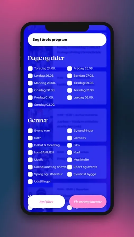 Vi kan ikke love, at vi hjælper dig med at finde kærligheden, men vi kan hjælpe dig med at finde en hel masse andet. I Festugens program har du mulighed for at søge efter genrer, tilgængelighed, dato, tidspunkt og meget mere. Tryk på knappen ’søg og filtrer’ inde i programmet og vælg de relevante kategorier.