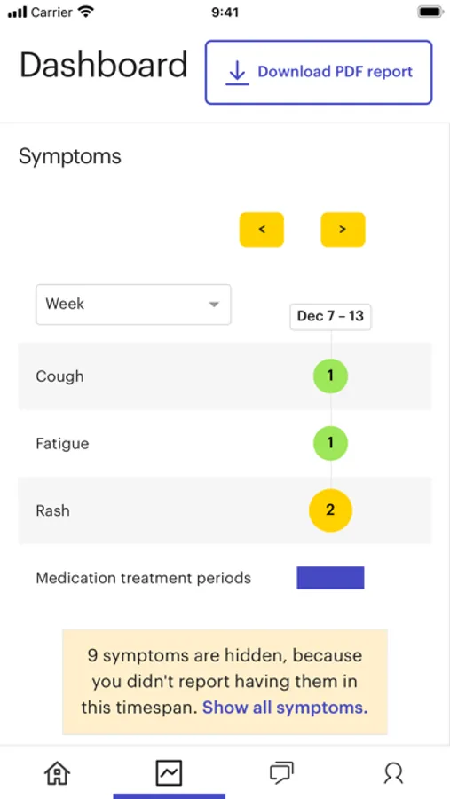 Report your symptoms and get feedback on how they’ve developed since the last report. Your care team will receive notifications of your reported symptoms and their development and will be up to date on your well-being.