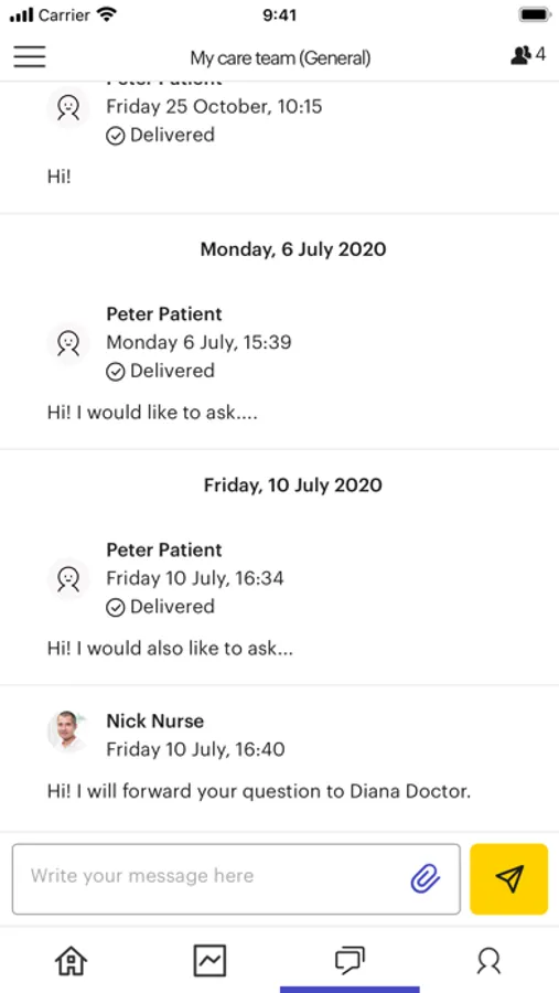 You are always just one message away from your care team. If you have non-urgent questions related to your treatment or symptoms, you can send a message to your care team. It is also possible to share attachments with your care team, such as a photo of your symptom. You can also access your previous messages with members of the care team whenever needed.