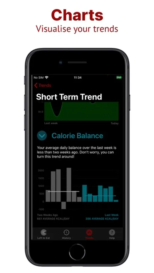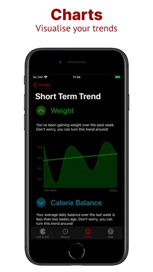 To meet your goals, it’s important to correct and maintain your habits over time, so Left to Eat also analyses and charts your trends - the free version shows your short term trend, and the Pro Version in-app purchase unlocks your medium and long term trends.