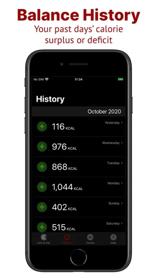 Left to Eat also shows the history of your daily calorie surplus or deficit - the free version lets you see the last 3 days of your history, and the Pro Version in-app purchase unlocks the last 3 years of your history.