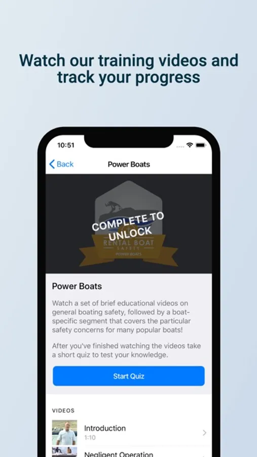 Here you can watch training videos regarding general boating safety and the individual type of boat you are renting as well as interact with safety checklists for use when renting a boat.