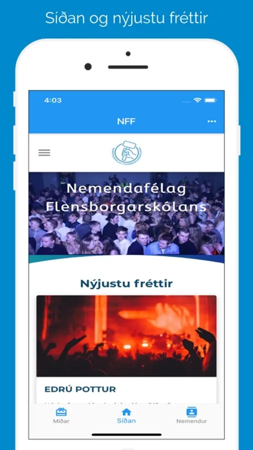 Skráðu þig inn til að fá nýjustu uppýsingar frá nemendafélaginu, leita eftir öðrum í símaskrá og einfalda miðageymslu fyrir viðburði.