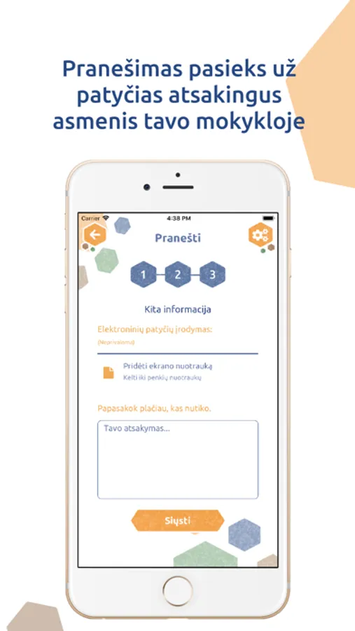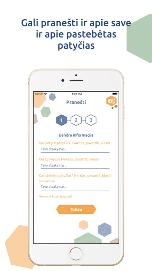 "Patyčių dėžutė" is a mobile application designed to allow students at participating schools to safely and anonymously report acts of bullying. Once the student makes report of bullying, it is automatically sent to the designated school member. It‘s also 100% anonymous!