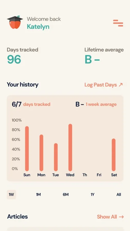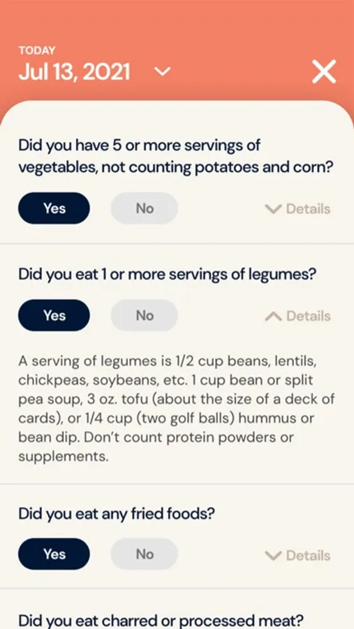 Every day, answer ten "yes" or "no" questions about what you ate that day and get instant nonjudgmental feedback on the quality of your diet, along with clear direction on how to improve your eating habits and nutrition. Then, watch your Nutrition GPA improve over time! It’s easy, fun, and effective. It’s also backed by decades of nutrition science and research.