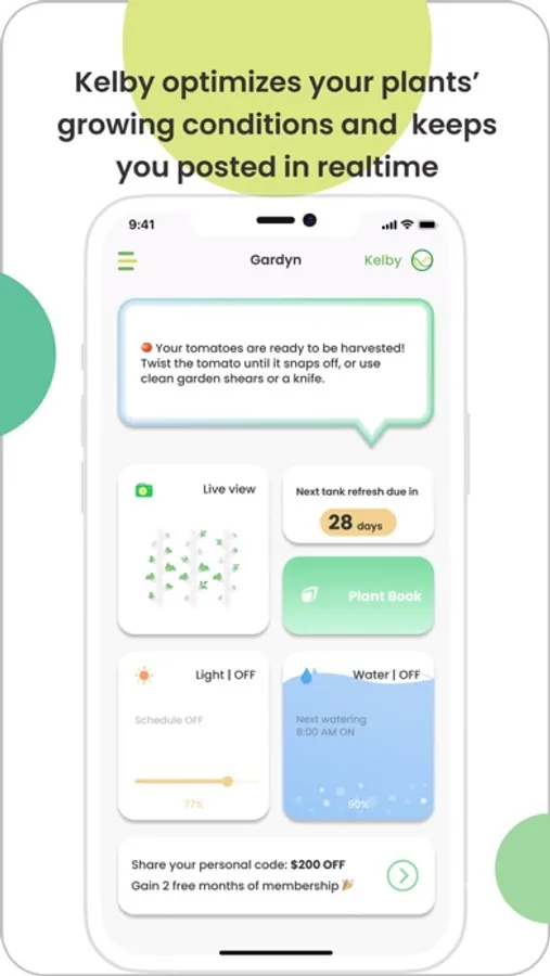 - Let Kelby, your smart private gardener, take care of your Gardyn and optimize it for you