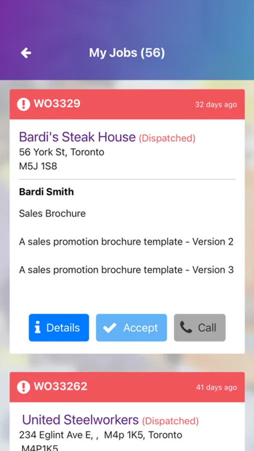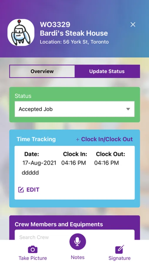 Features: View Assigned Jobs, Update Work Order Status, Log Hours, Upload Photos, Add Service & Material Notes, Call & Get Directions to Job Site.