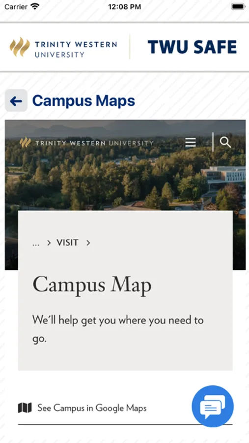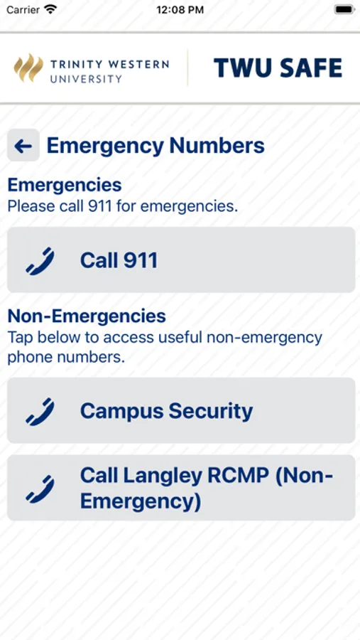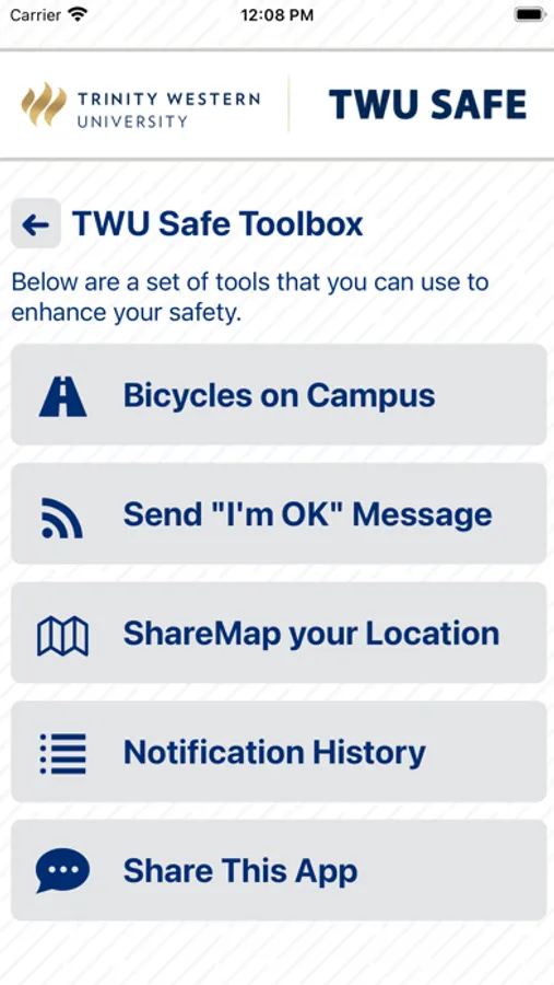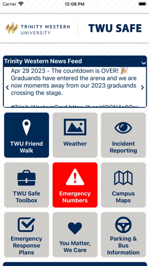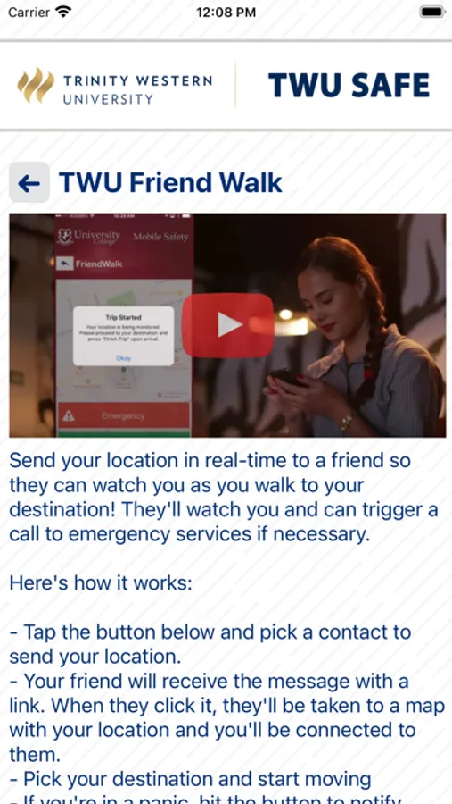 TWU Safe is the official safety app of Trinity Western University. It is the only app that integrates with TWU's safety and security systems. Campus Security has worked to develop a unique app that provides students, faculty and staff with added safety on the TWU campus. The app will send you important safety alerts and provide instant access to campus safety resources.