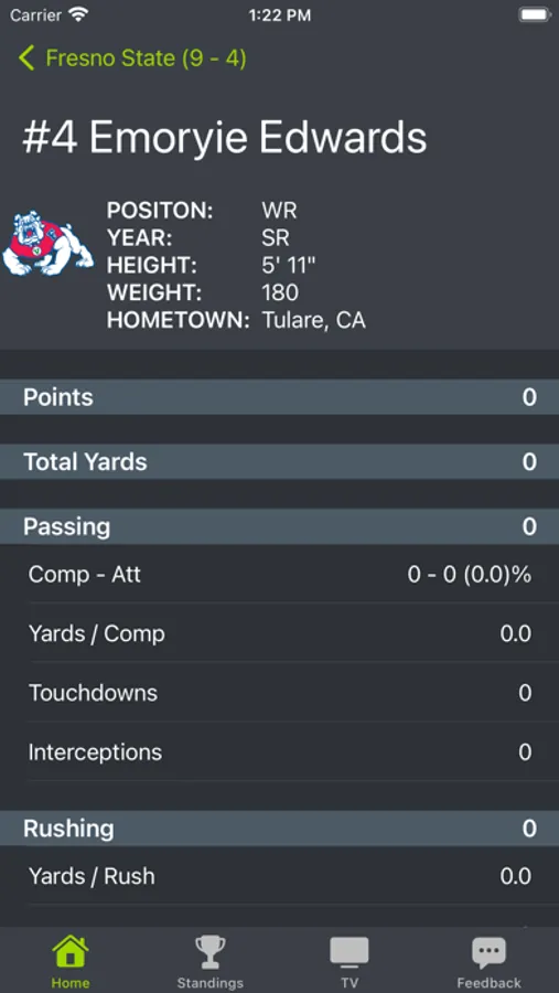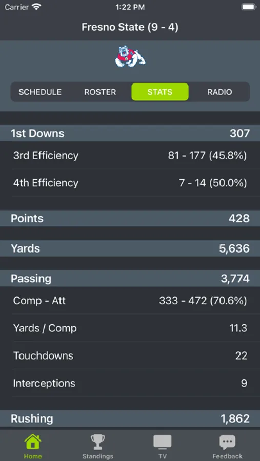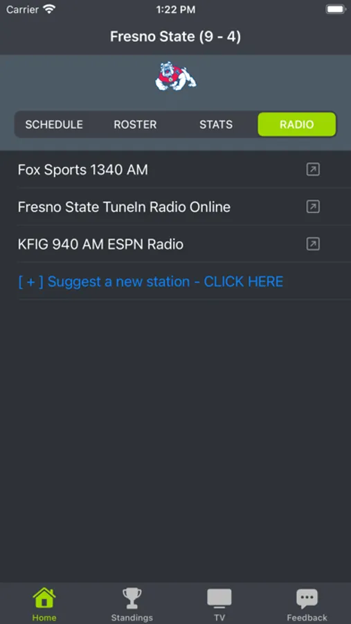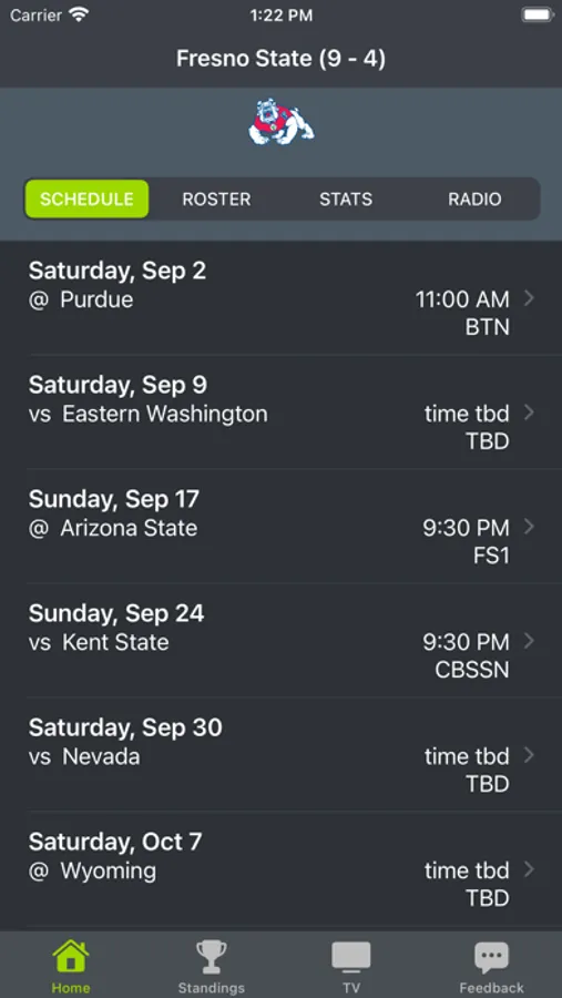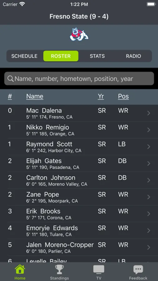 Fresno State Football App provides scores, links to live radio, schedules, tv channels, player profiles, and game matchups in one location.