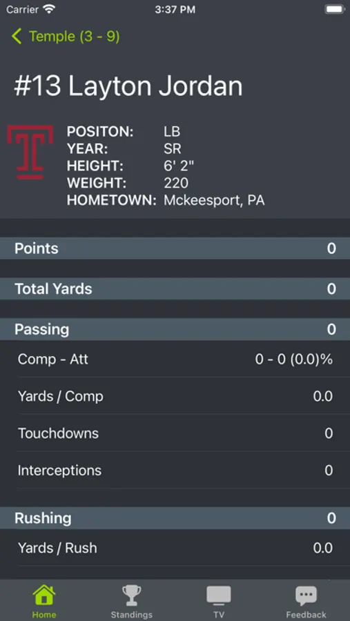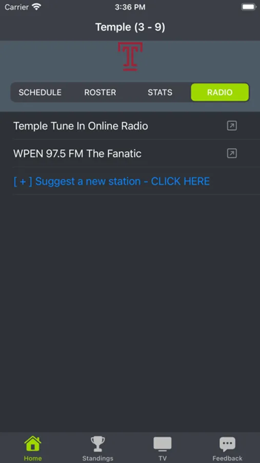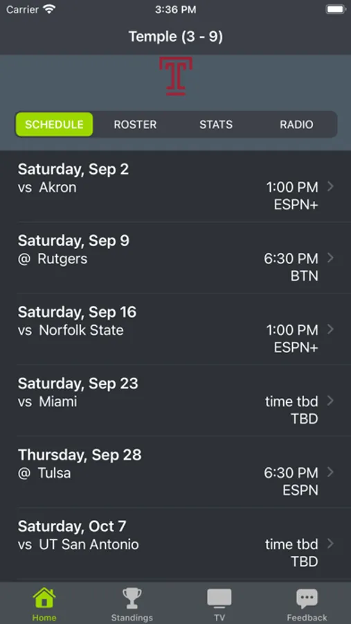 Temple Football App provides scores, links to live radio, schedules, tv channels, player profiles, and game matchups in one location.