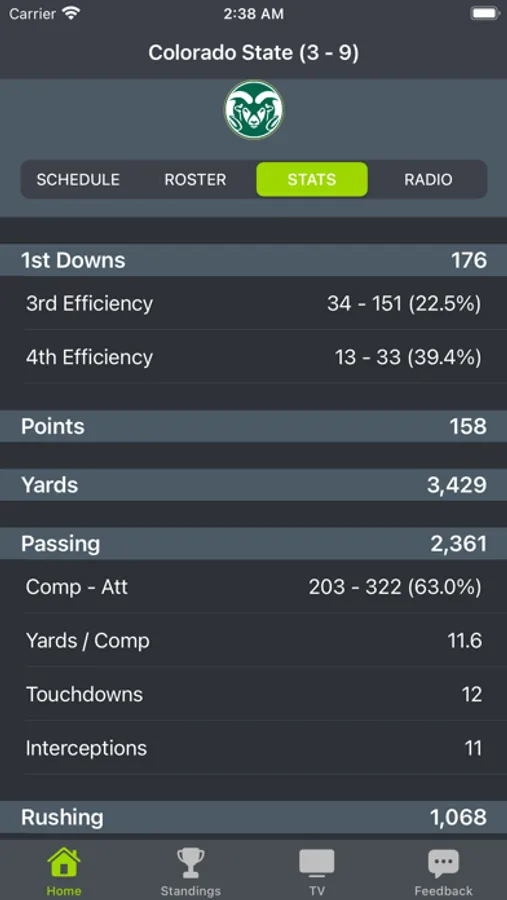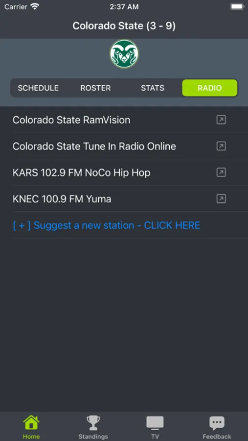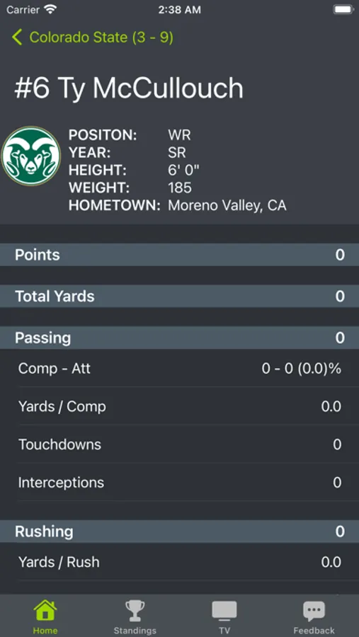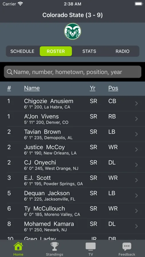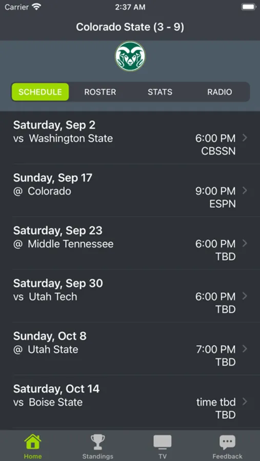Colorado State Football App provides scores, links to live radio, schedules, tv channels, player profiles, and game matchups in one location.