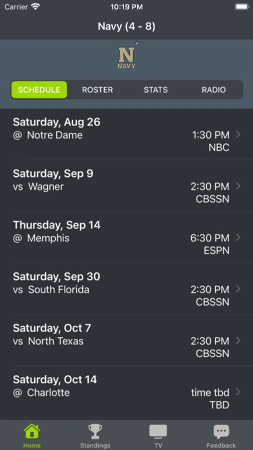 Navy Football Schedules provides scores, links to live radio, schedules, tv channels, player profiles, and game matchups in one location.