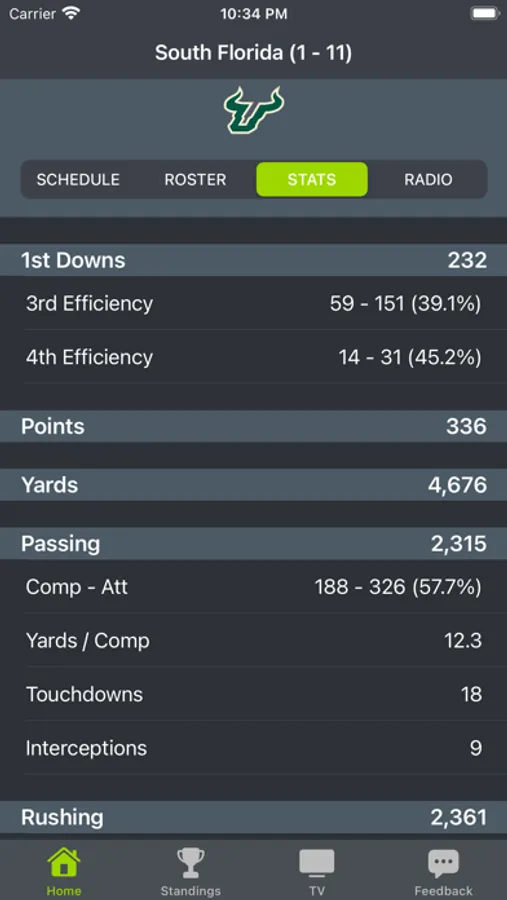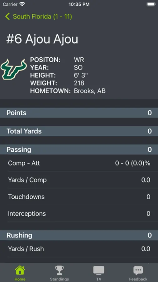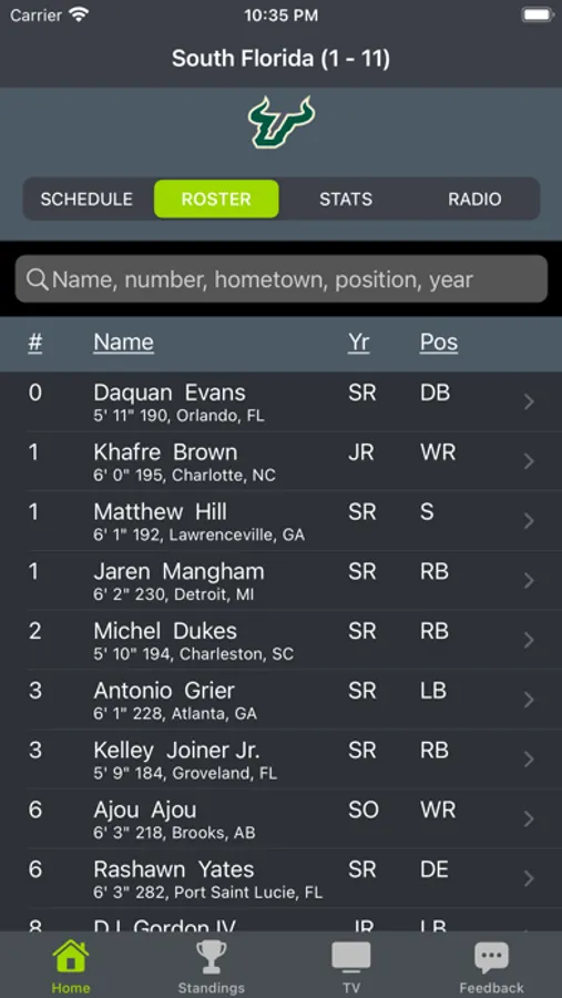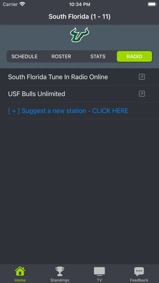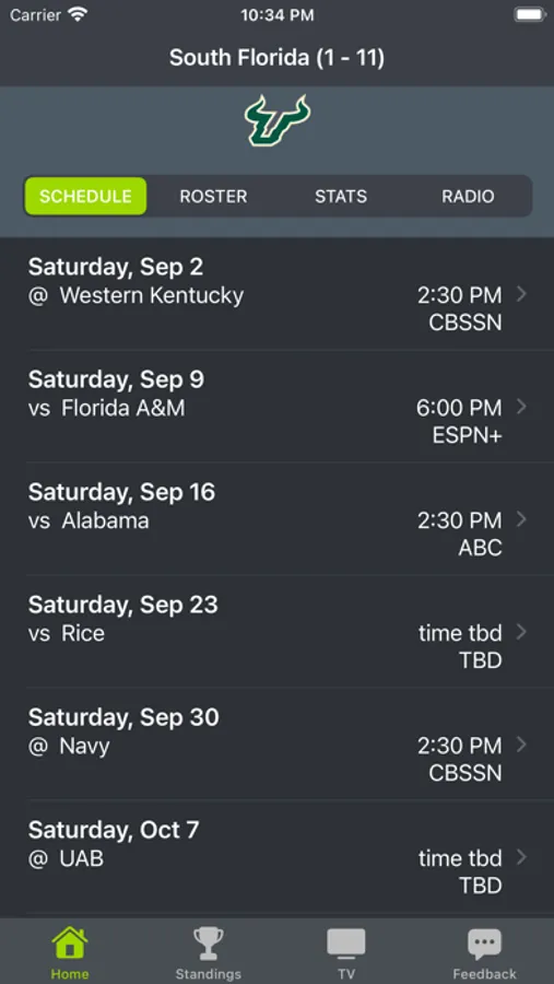South Florida Football App provides scores, links to live radio, schedules, tv channels, player profiles, and game matchups in one location.