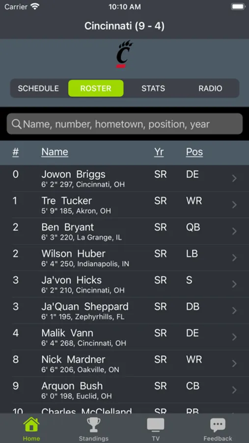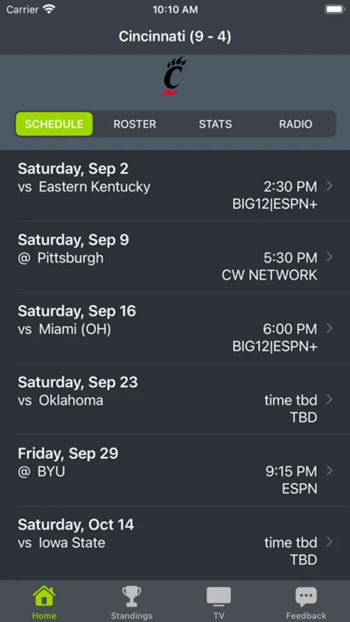 Cincinnati Football Schedules provides scores, links to live radio, schedules, tv channels, player profiles, and game matchups in one location.