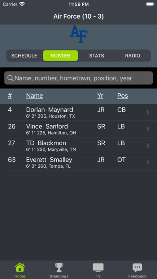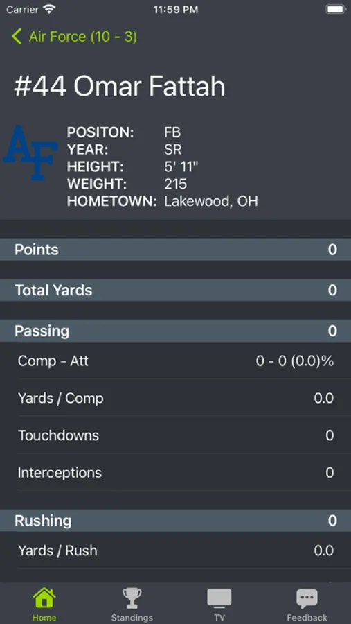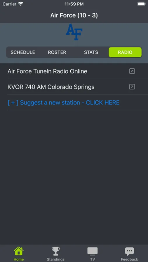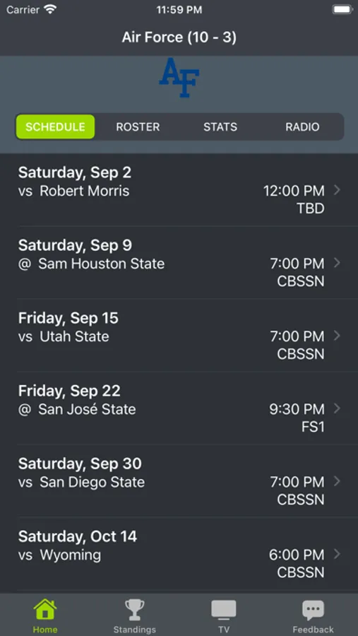 Air Force Football Schedules provides scores, links to live radio, schedules, tv channels, player profiles, and game matchups in one location.