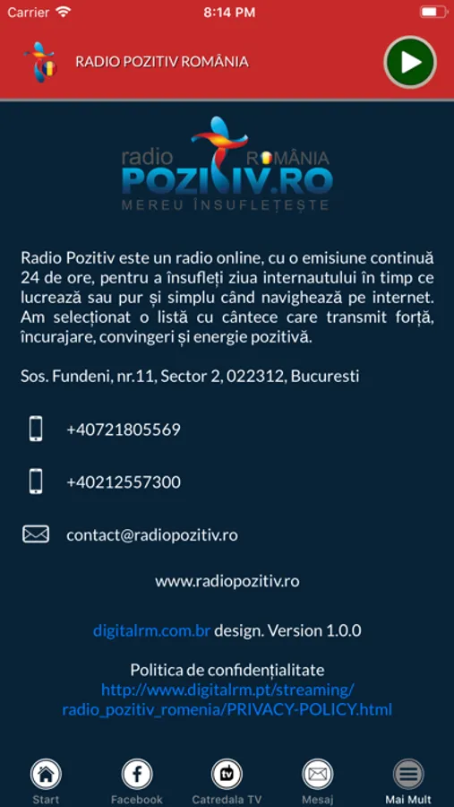Radio Pozitiv este un radio online, cu o emisiune continuă 24 de ore, pentru a însufleți ziua internautului în timp ce lucrează sau pur și simplu când navighează pe internet. Am selecționat o listă cu cântece care transmit forță, încurajare, convingeri și energie pozitivă.