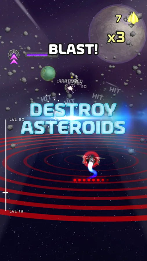 * Drag your finger left-right (BONUS levels up-down!) to avoid flying and stationary asteroids