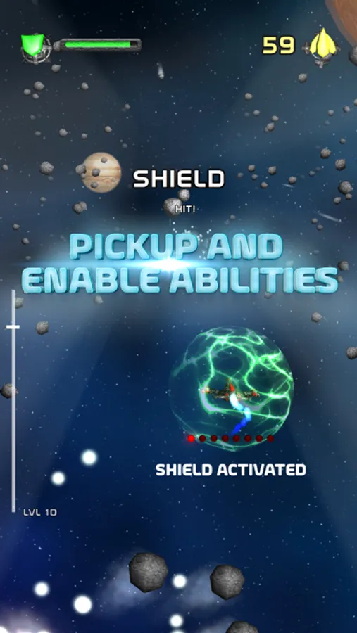* Pick up shields or blasts to protect your ship or destroy asteroids around you