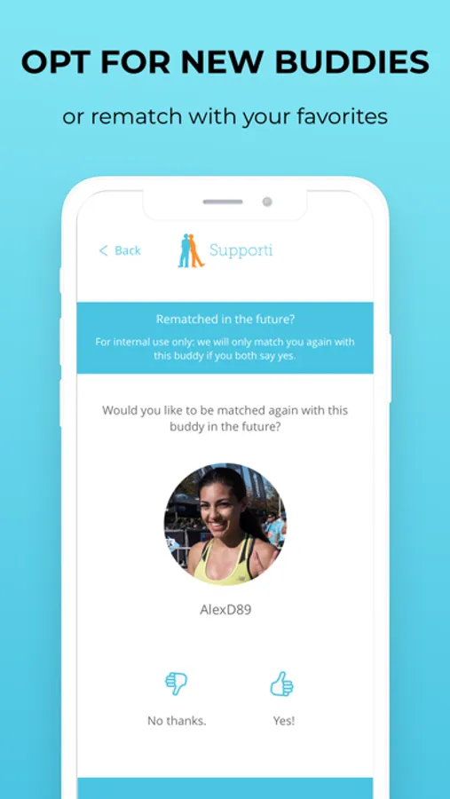Finally, you don’t need to swipe through a bunch of profiles or have awkward conversations to find the perfect accountability partner. Supporti uses our proprietary best practices based on thousands of matches to find you encouraging partners from our amazing community, and every 7 days you can opt to continue with your buddy or get matched with somebody new. No ghosting or difficult conversations necessary.