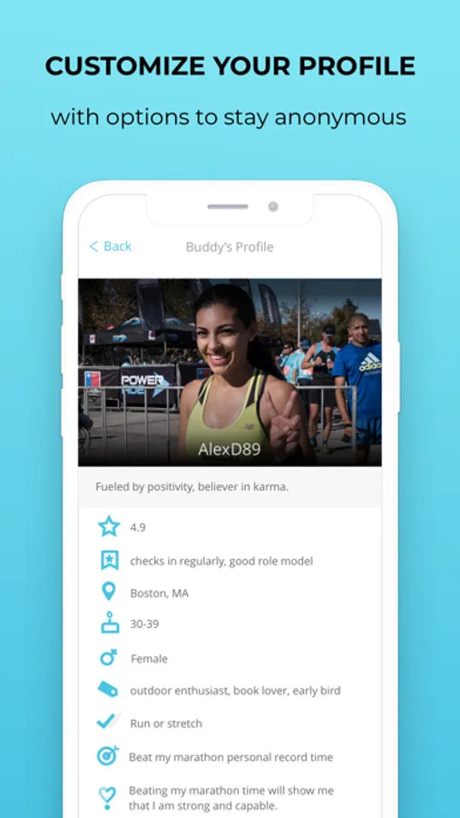- Customize your profile to tell your buddy about your goals and interests while remaining anonymous