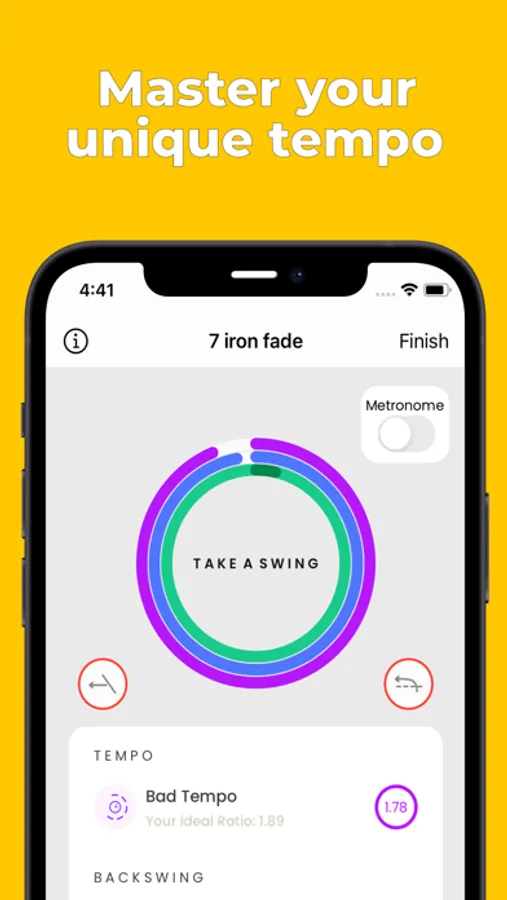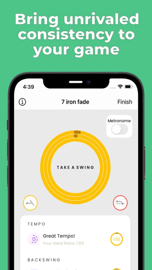 Use the CTRL™ metronome, set to your ideal tempo, to help you swing consistently every single time. Find out if you are too fast or slow during your backswing and downswing. Recognize if your club face needs to be more open or closed. How in-to-out or out-to-in your club path should be. All compared to YOUR ideal swing.
