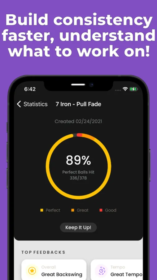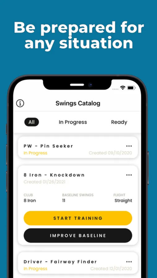 Create a baseline for as many swings as you want. You can create multiple baselines for each club, shot type, distance, etc. Work on your knockdown fade or lock in your wedge distances. The sky is the limit! You are in control of your baselines so that you can work on the parts of your game that are most important to you. Get more comfortable and increase your consistency with any shot you can’t seem to pull off on the course!
