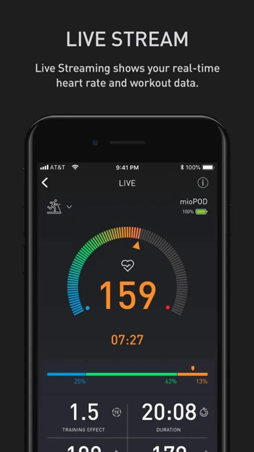 The Mio APP connects to the new mioPOD - the heart rate training tracker. Pair your mioPOD with the Mio APP, select your desired training Heart Rate zones, and the MIO Cardio Pilot™ will prompt you to stay within your personal training intensity targets via haptic feedback and glanceable color light alerts.