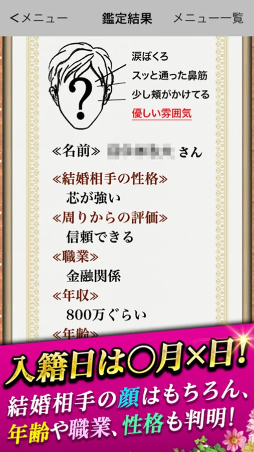 更に、結婚相手を見逃さないように、相手の顔も名前も、性格や職業も判明!