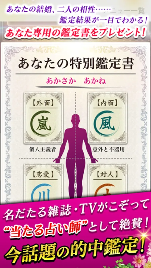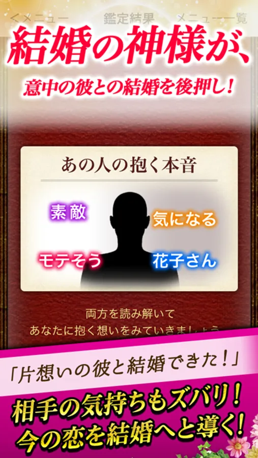 本アプリでは、結婚の神様・洸十鈴の鑑定を受けることができます。