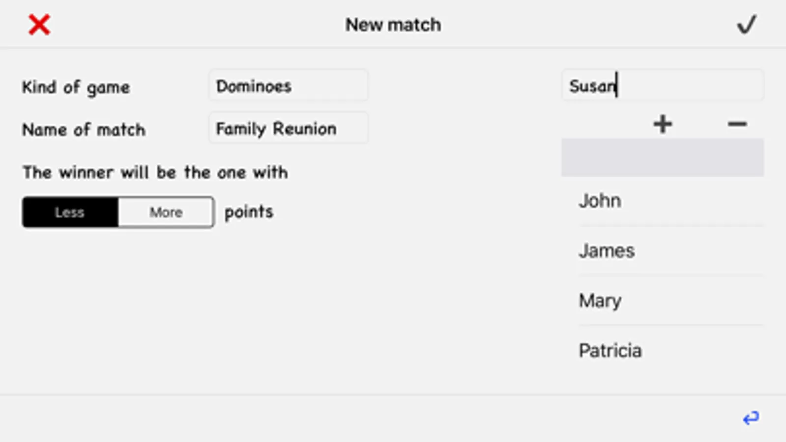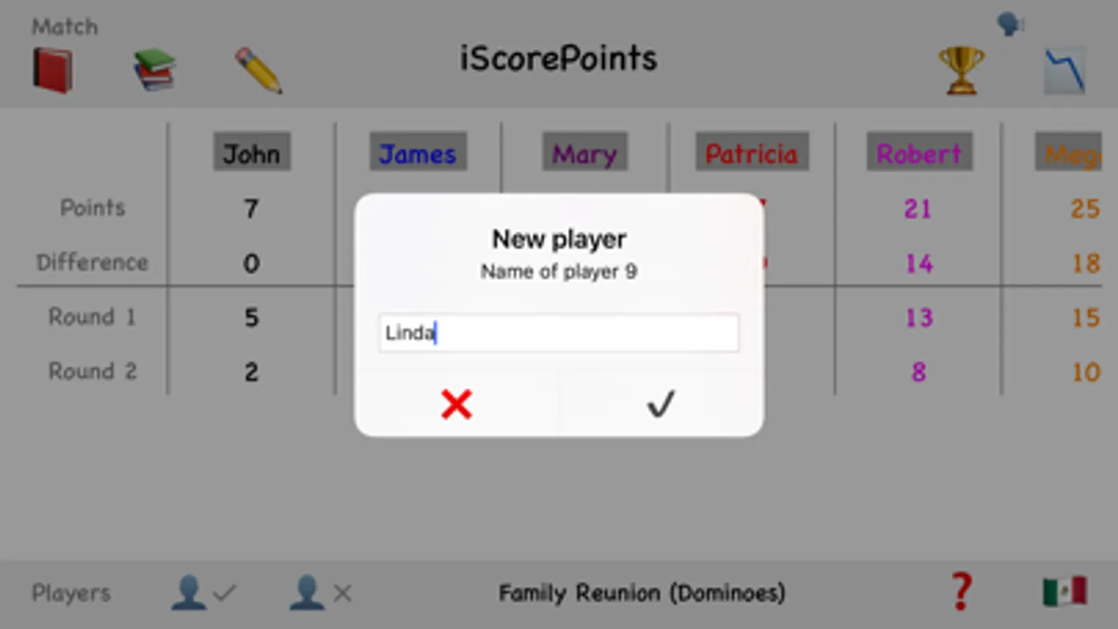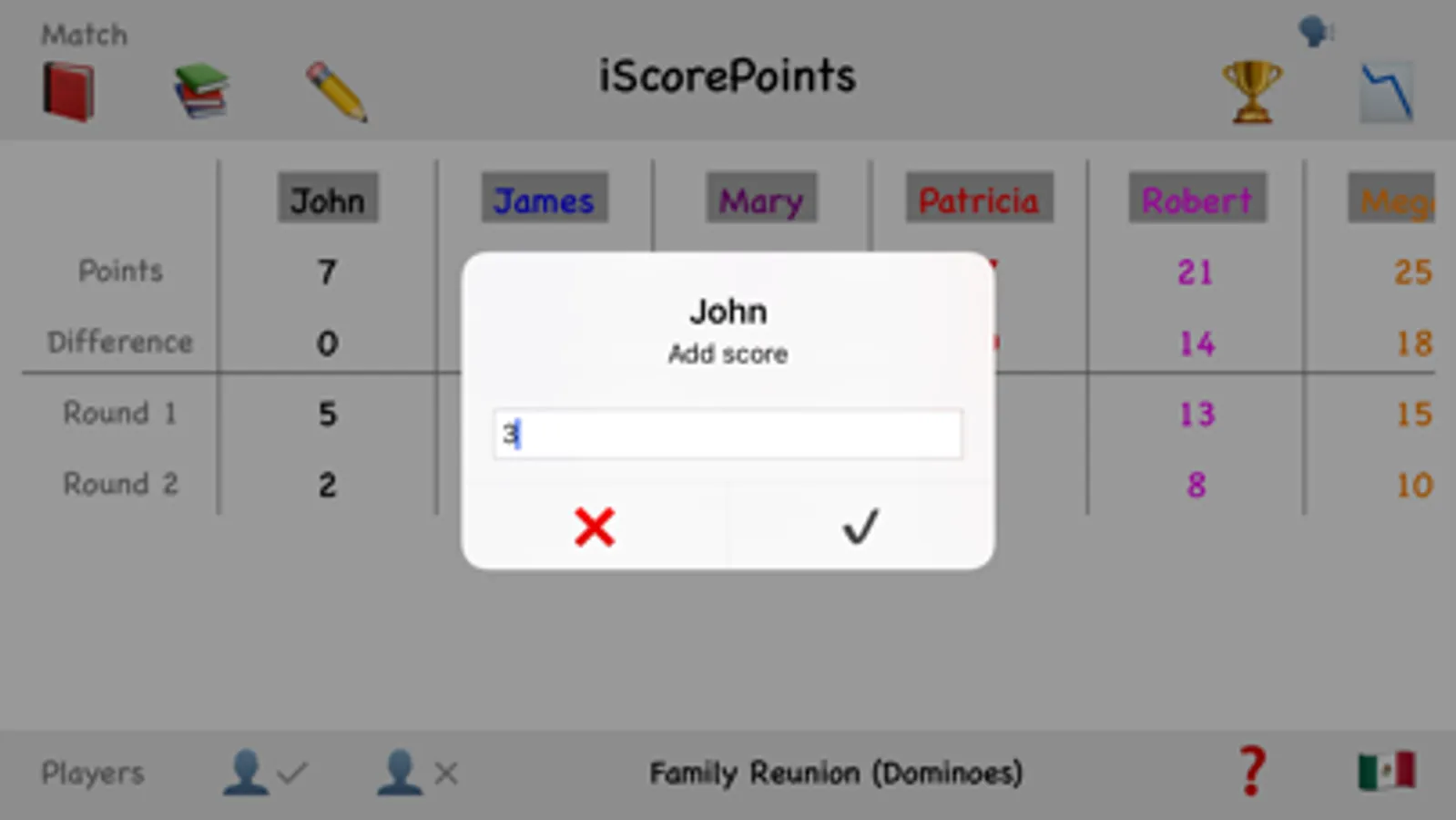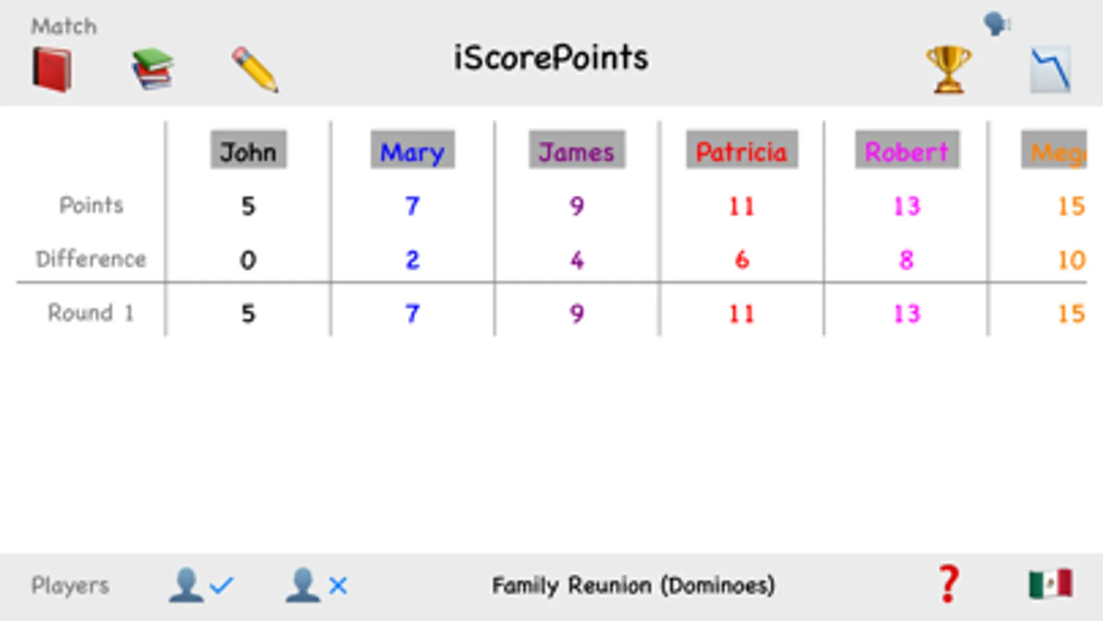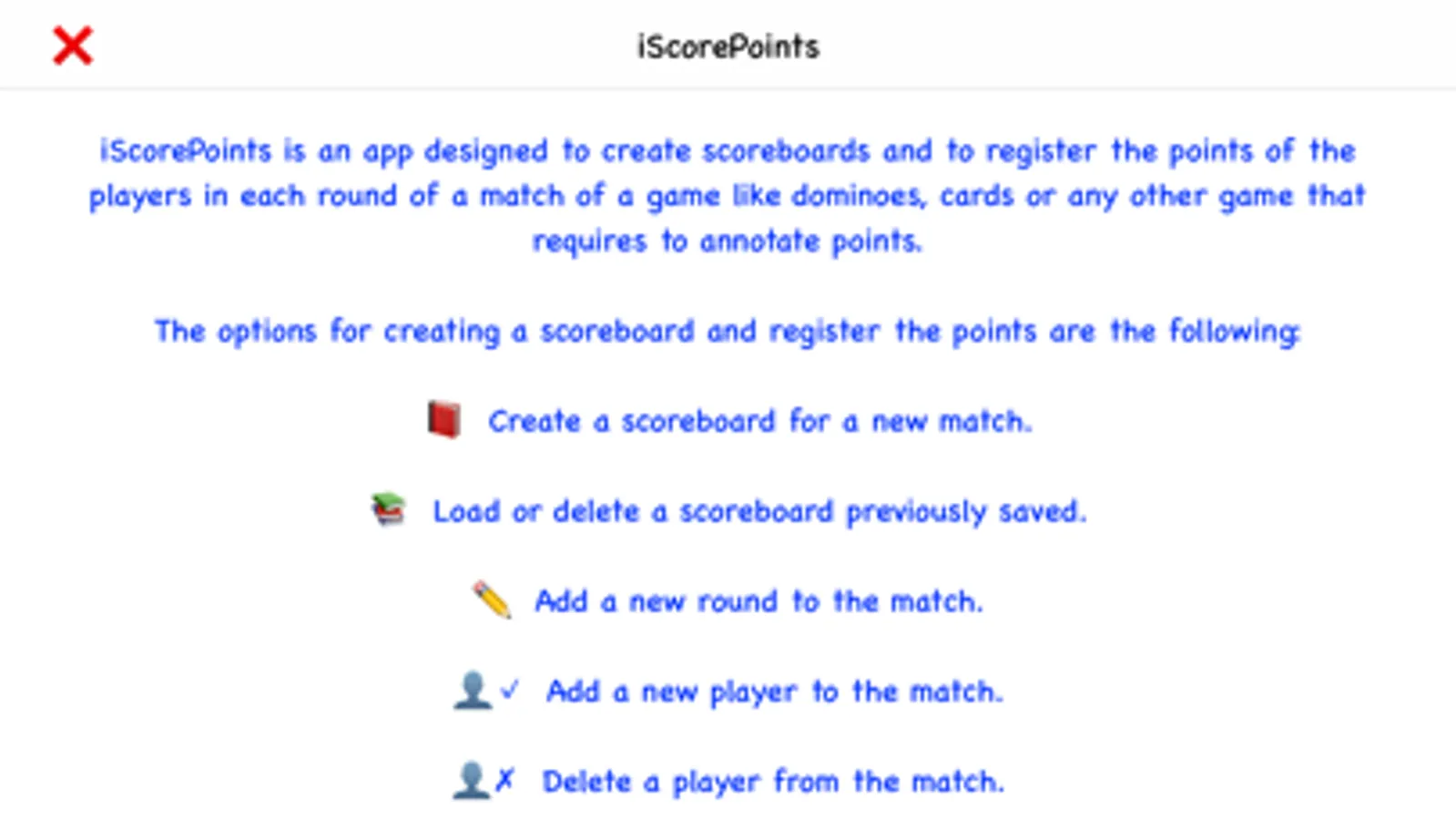 iScorePoints is an app designed to create scoreboards and to register the points of the players in each round of a match of a game like dominoes, cards or any other game that requires to annotate points.