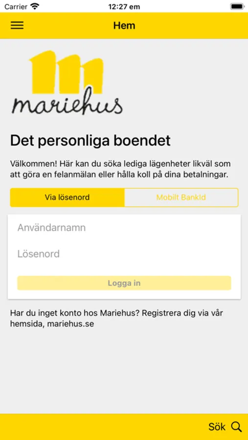 Med Mariehus AB bostadsapp söker du lediga lägenheter och fordonsplatser. För att kunna göra intresseanmälningar och svara på erbjudanden behöver du vara registrerad som sökande hos Mariehus AB bostäder vilket du gör direkt i appen eller på vår hemsida. Det är samma inloggningsuppgifter i appen som på ”Mina sidor”. Du som är hyresgäst kan logga in och hantera frågor som rör ditt boende direkt i din telefon.