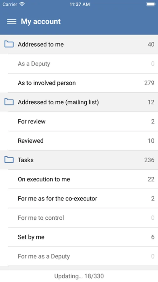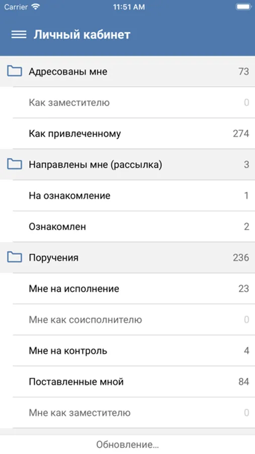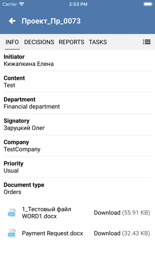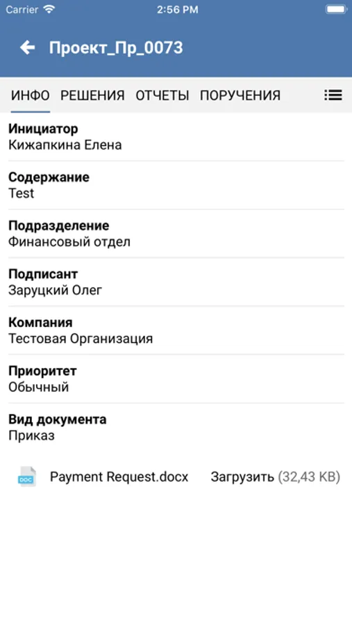 Просмотр файлов документа, листа согласования, основных полей карточки, истории решений по документу;