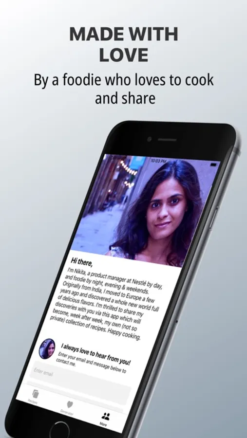 I'm Nikita, a product manager at Nestlé by day, and foodie by night, evening & weekends. Originally from India, I moved to Europe a few years ago and discovered a whole new world full of delicious flavors. I'm thrilled to share my discoveries with you via this app which will become, week after week, my own (not so private) collection of recipes. Happy cooking.