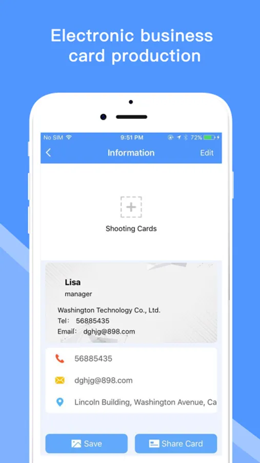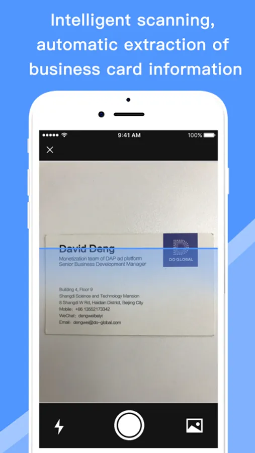Use your mobile phone to take business cards, automatically identify business card information and save it into your mobile phone. You don't have to worry about losing your business card. When you place your customers, you can view them through electronic business cards.