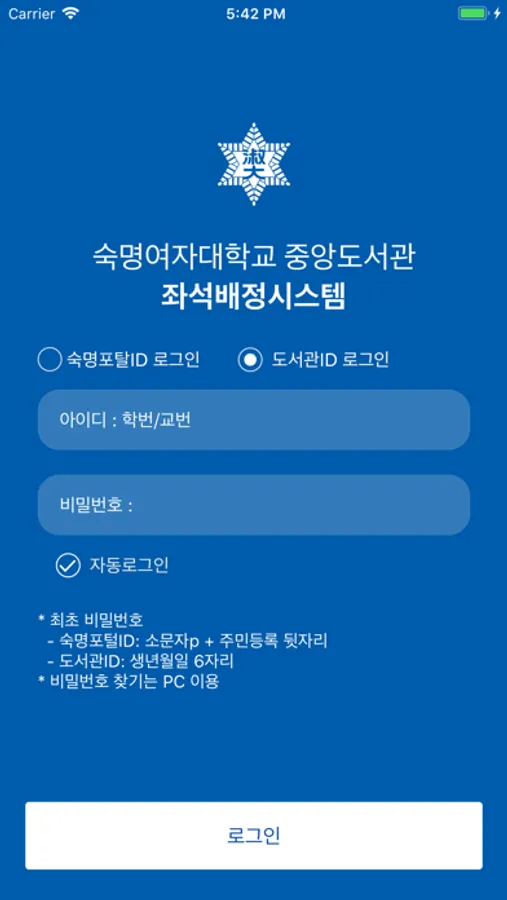 숙명여자대학교 중앙도서관 열람실좌석배정 및 스터디룸 예약 할수있는 어플리케이션입니다.