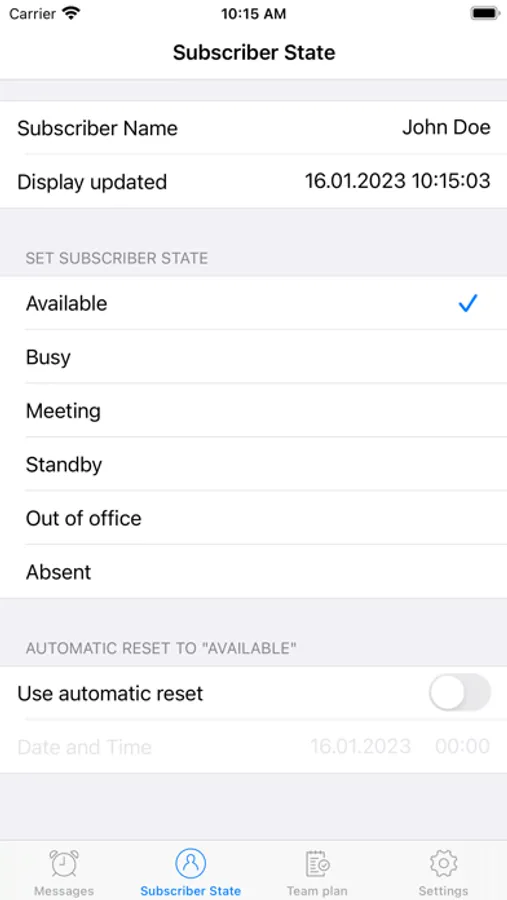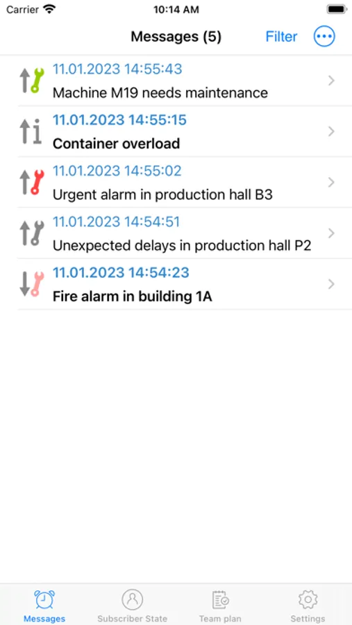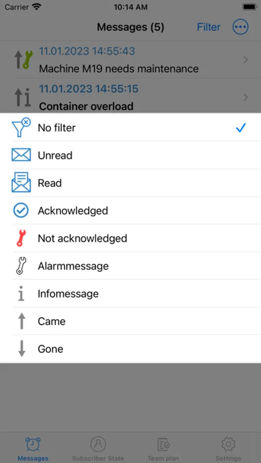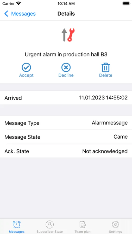 Received messages are clearly listed. Additional details can be viewed, e.g. the time when the message was received or acknowledged. Using the subscriber status feature, the subscriber status can be set comfortably at any time. The redesigned app will be continuously improved. New functionality will be added in the process. If you have any questions, ideas or comments do not hesitate and send an e-mail to support@alarmcontrolcenter.de.