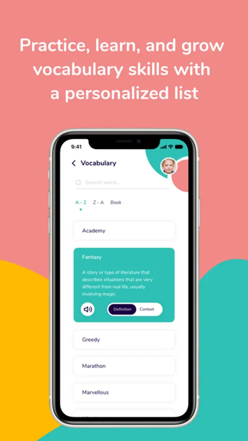 Readability makes it easy to learn new words and their meaning with a personalized vocabulary list for your child. Your child can long-press on any word while reading to learn its pronunciation, meaning, and add it to their vocabulary list. Their vocabulary list is neatly organized A-Z and by book to further practice, review, and perfect new or difficult words.