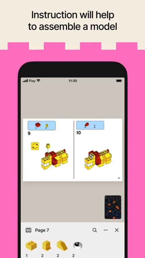 4. Find any brick you want easily. Just choose a detail in our catalog, and the app will highlight where it lies in your pile. Bricks you need by instruction are highlighted on the steps you need them.