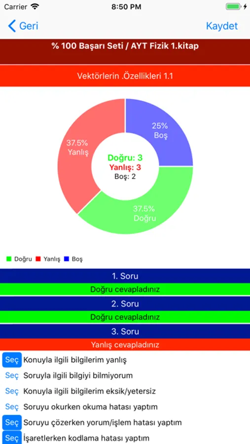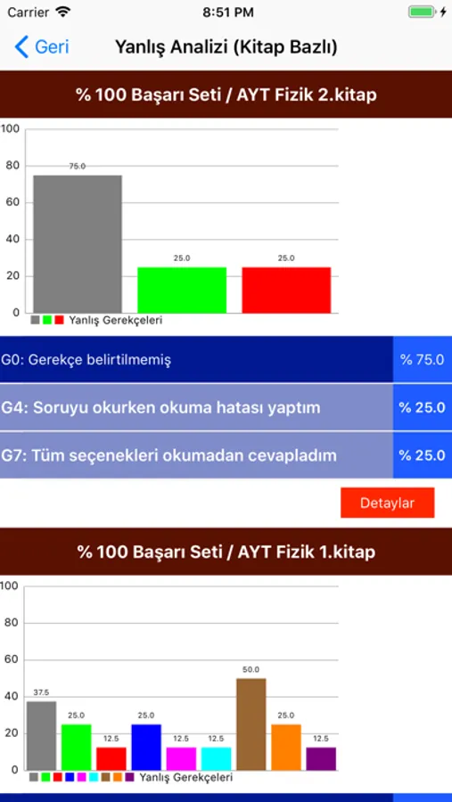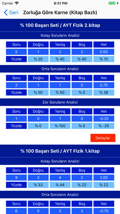 Zorluk seviyesine göre soruların analizlerini, kitap/ünite/test bazlı olarak alabilirsiniz.