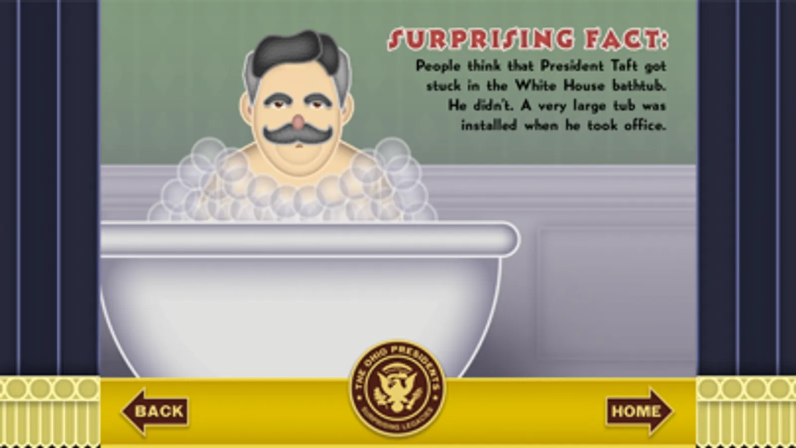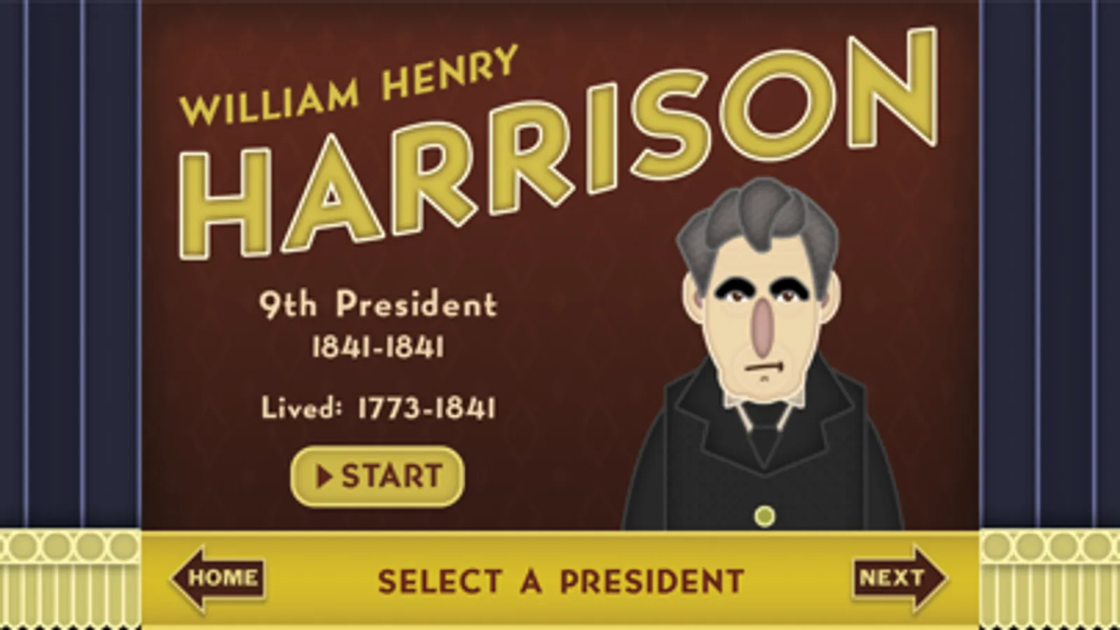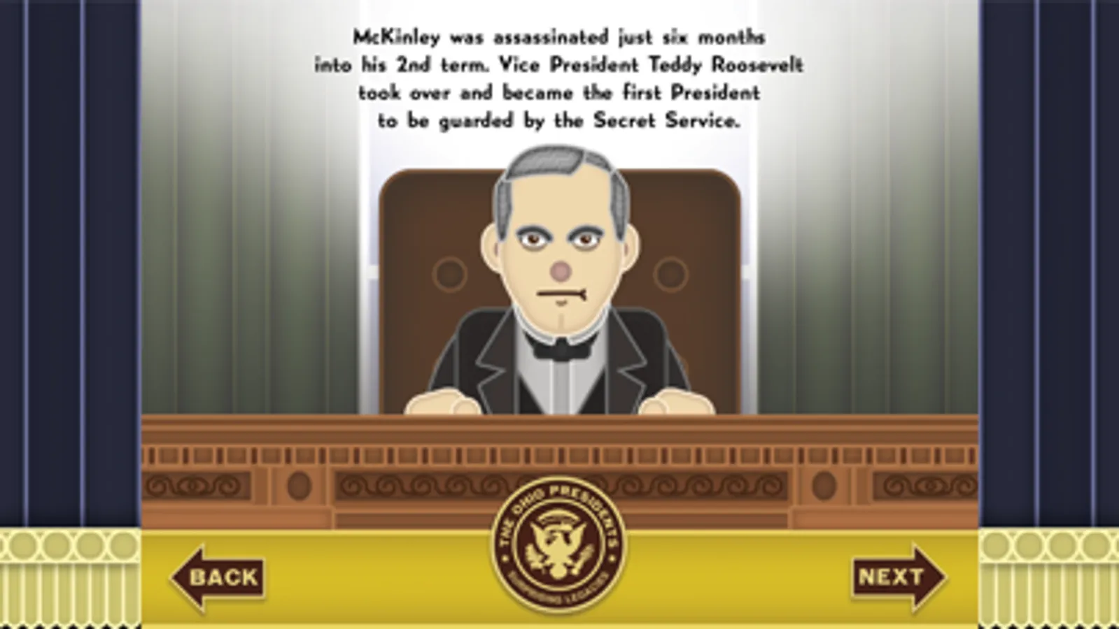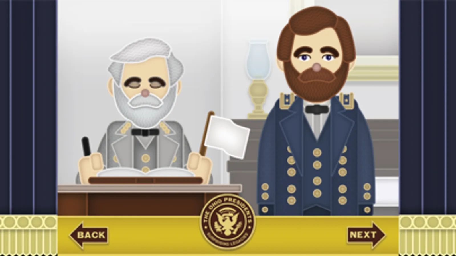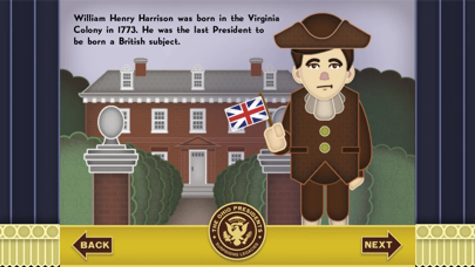 The United States has had eight Presidents from Ohio, serving between the years 1841 and 1923. This interactive storybook app tells their stories. Learn about the Ohio Presidents through dynamic animated stories about their lives, featuring fun sound effects and music. Featuring Presidents Harrison (both William Henry and Benjamin), Grant, Hayes, Garfield, McKinley, Taft, and Harding.
