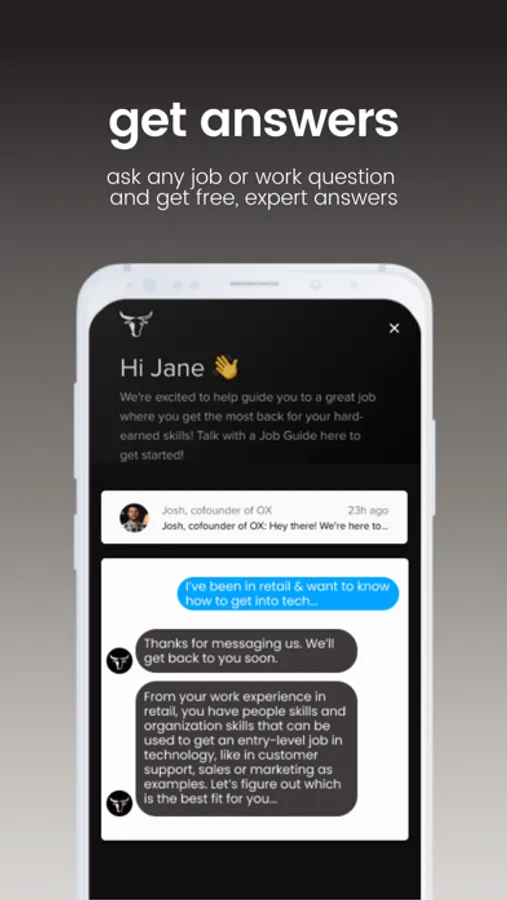Looking for jobs that hire for your skills? Or companies hiring near you? Ask any job or work question and you’ll get a free, 5 minute expert answer. Ox users ask us questions like - “I’m in retail and I want to get into marketing. Where do I start?” and “How do I get started in a healthcare job?” or “Which job skills will help me get started in IT?”