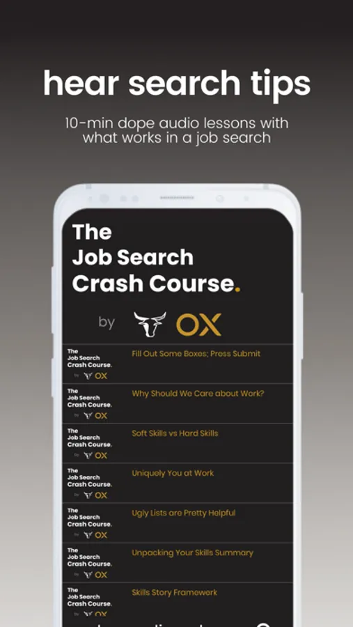 Need a job that will set you up for success? The Ox Job Search Crash Course has the goods. Jam-packed 10 minute audio episodes are loaded with tips and tricks you can use right away to land the job you’ve been looking for. No filler, just straight up, easy to follow examples with what works in a job search and what doesn’t.