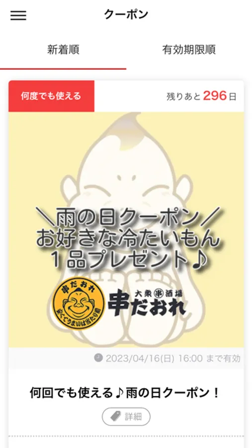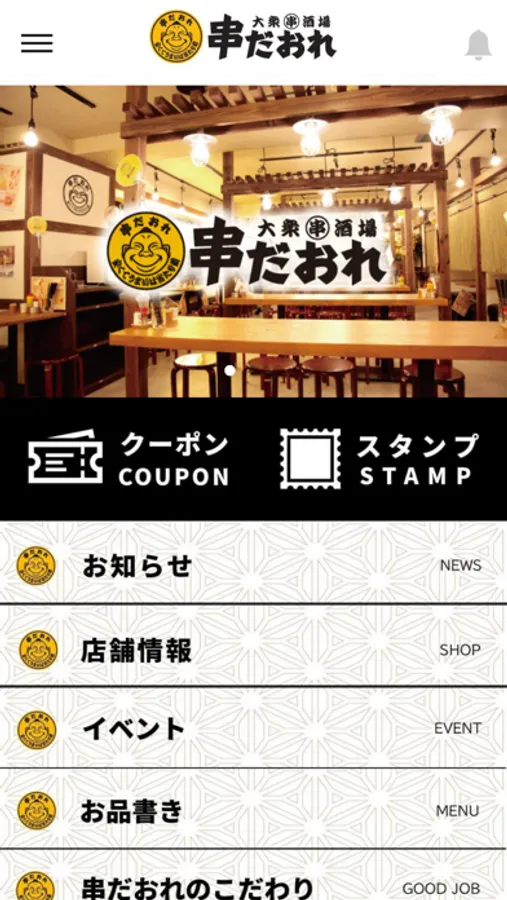「大衆串酒場串だおれ」公式アプリでは、対象店舗のお得なキャンペーン情報や、アプリ限定クーポン等を随時配信します。