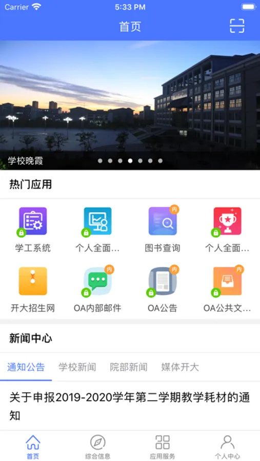 欢迎使用开封大学智慧校园App,你可以使用学校分配给您的学/工号登录,查看校园动态,快捷办理事务。