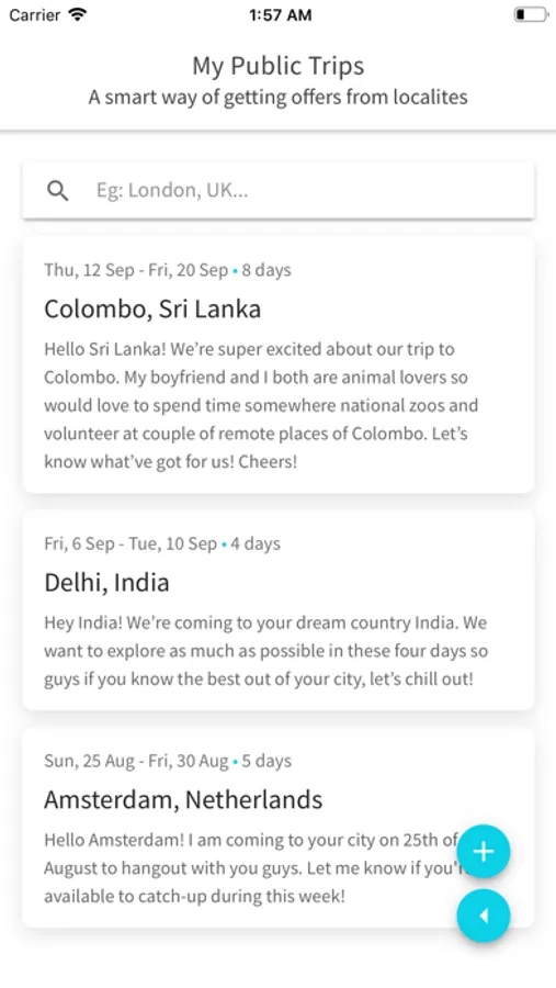 You can chat with locals across the globe, hire them for your trip. And, yes, don't forget to ask them if they can host you at their place (if they can) or not! This way, have endless fun with them. Schedule a trip now, whether it's private or personalized, it's up to you. Must have a travel app for every backpacker & digital nomads. And if you're not traveling, be a localite, meet travelers, make friends, and earn hourly. Connect with localites whenever and wherever!