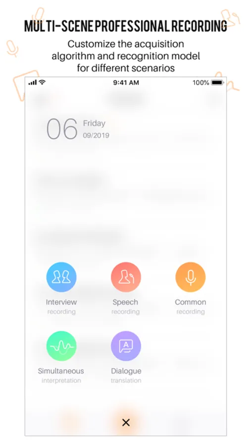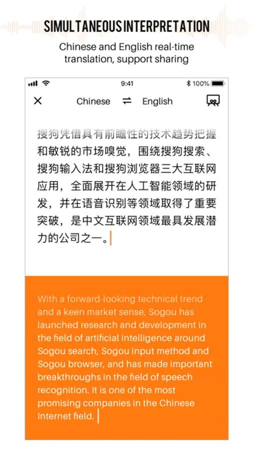 While not interrupting the speakers, App translates speech voice to the targeted language. Clicking simultaneous interpretation on the APP to begin simultaneous interpretation. The speakers are recommended to wear the Recording Pen to use.