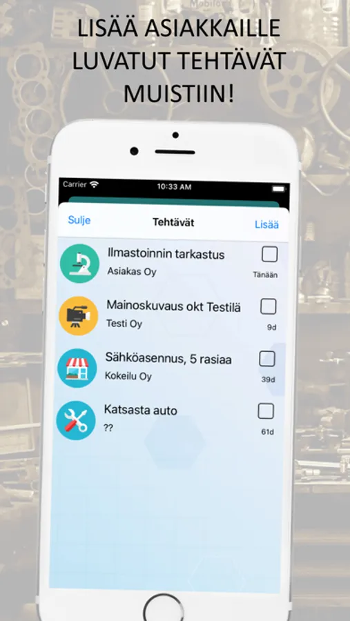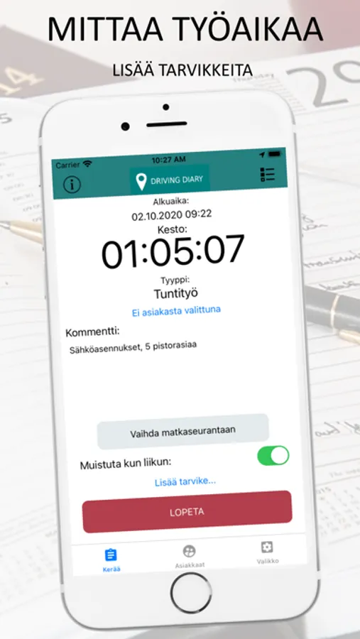 Tuntiseurannalla saat kerättyä työtunnit. Ohjelma vaihtaa automaattisesti matkan keräämisen tuntityöksi kun olet pysähtynyt. Lisää asiakkaita ja saat kohdistettua matkat ja työt asiakkaalle. Asiakkaan yhteenvedolla saat kätevästi laskutusaineistoa!