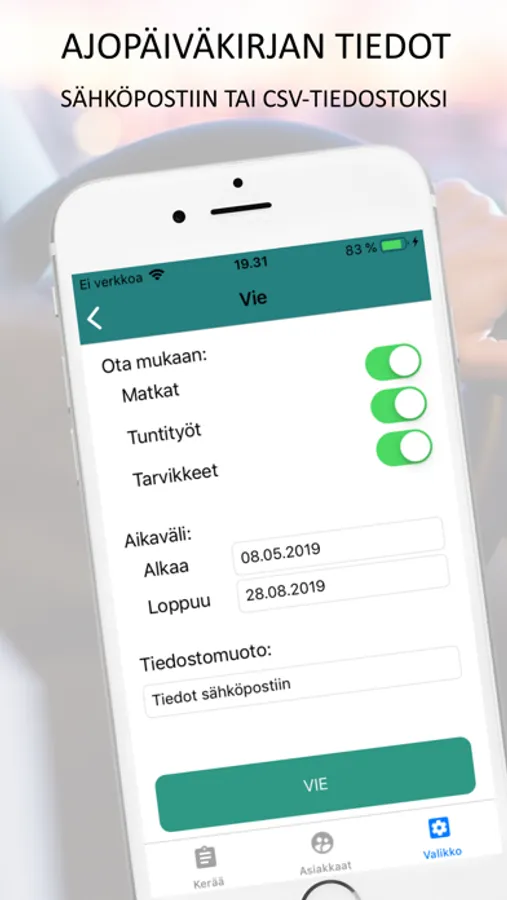 Matkatiedot viedään joko sähköpostiin tai CSV-tiedostoksi. CSV-tiedoston voi avata Excelillä.
